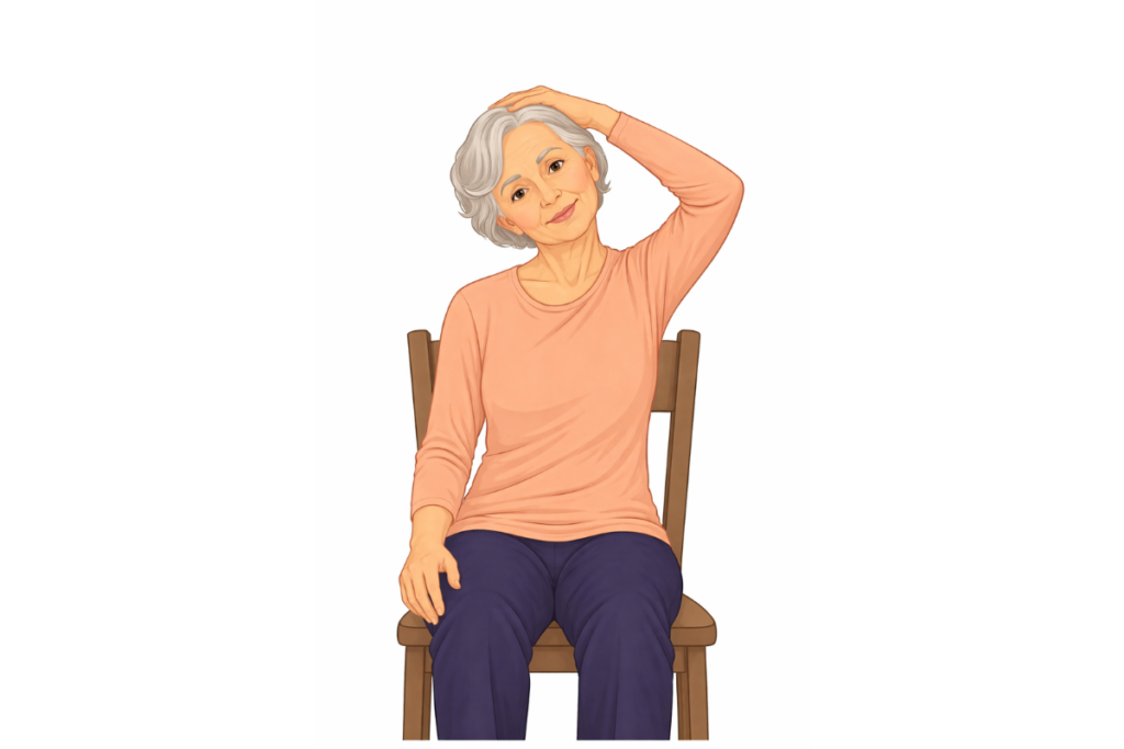 2. For a deeper stretch, gently rest your right hand on top of your head (no pulling, just light pressure).