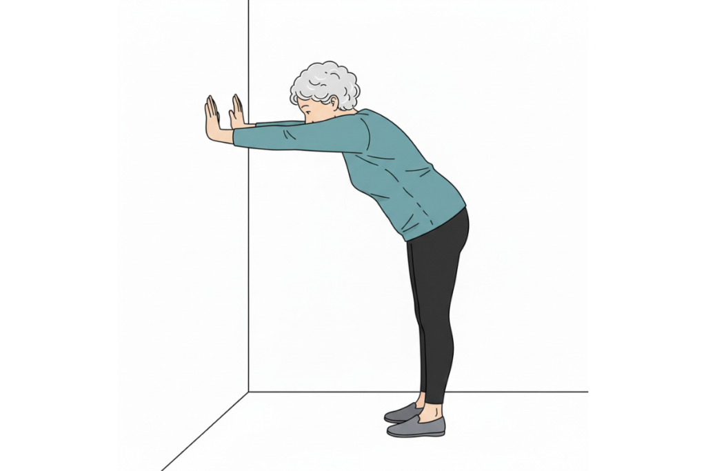 - Place your hands on the wall at shoulder height.